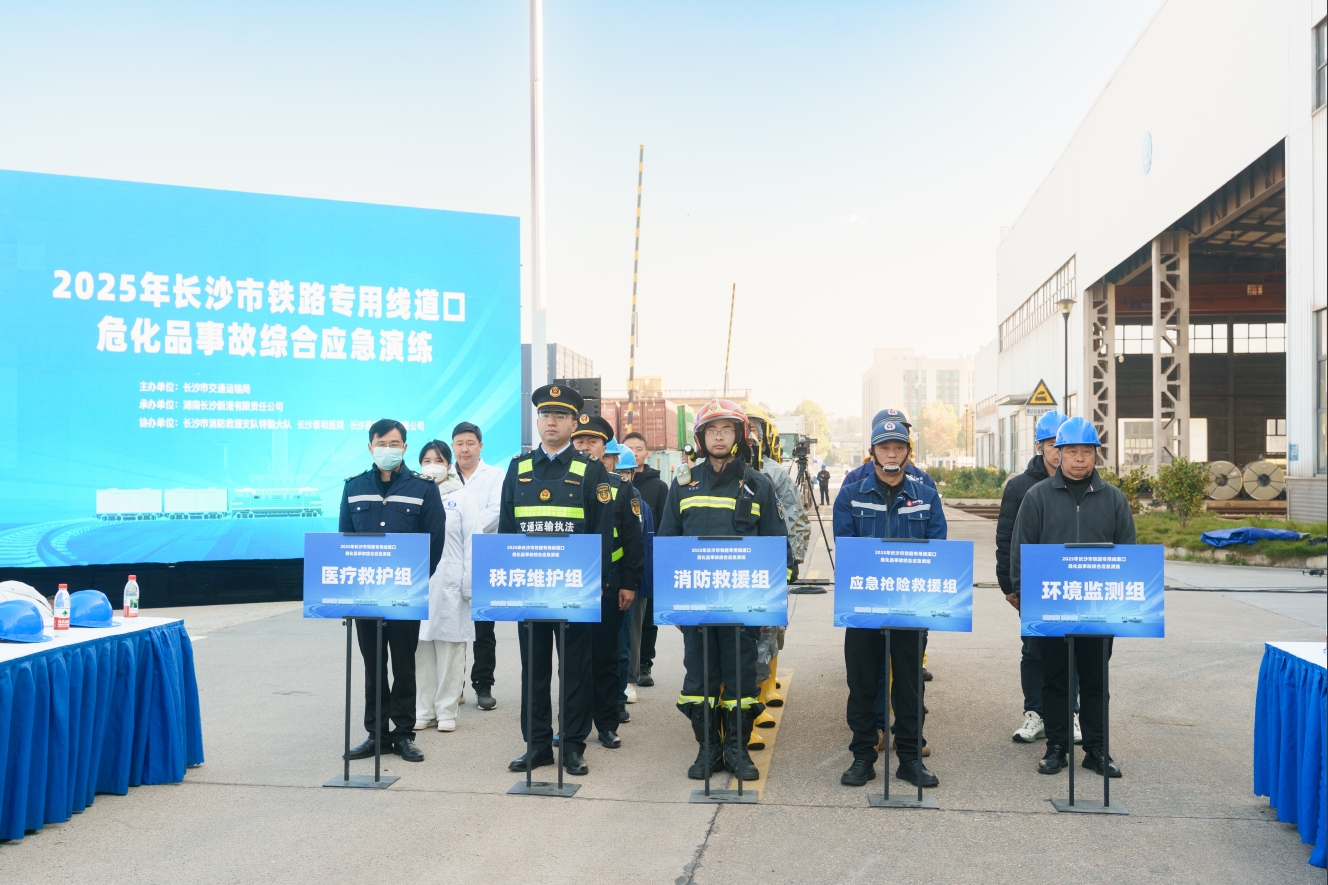 11月21日,2025年長沙市鐵路專用線道口危化品事故綜合應急演練在長沙新港公司舉行,演練由長沙市交通運輸局主辦,長沙新港公司承辦,長沙市市生態環境局、開福區消防救援大隊、長沙泰和醫院參加。 演練模擬一輛裝有甲醇二甲胺的危化品槽罐車經過鐵路道口時,因雨天路滑發生事故,導致裝載物泄露,一名司乘人員被困車內,一列火車即將通過道口,情況十分危急。道口值班人員發現事故后,第一時間通知車站信號樓,并緊急采用手旗信號截停列車,避免發生二次事故并造成更嚴重的后果,同時,值班員迅速向長沙新港公司報告事故情況,包括泄漏罐車的位置、泄漏程度、是否有起火、人員受困或傷亡等信息,長沙新港公司迅速啟動應急預案。應急救援、警戒疏散等多個小組攜帶裝備5分鐘內集結完畢,奔赴事故現場處置。隨后,消防救援人員、醫療救護人員、環境監測人員等各司其職,聯合處置了這一起突發事件。