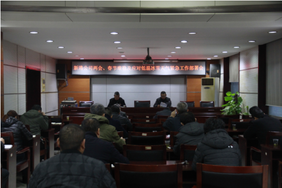 公司領導高度重視,召開工作部署緊急會議。 1月25日下午五點半,新港公司召開“兩會春節維穩及應對低溫冰雪天氣緊急工作部署會”。會上,首先由公司副總辛華同志傳達了市政府《關于進一步做好應對低溫雨雪冰凍天氣工作的緊急通知》以及交通集團領導對維穩和安全工作的指示精神,并針對新港公司實際情況要求各部門和單位采取措施,做好應對防范工作。接著,新港公司黨委書記、董事長唐忠良同志做出重要指示,當前公司工作重點要放在安全和維穩上,公司領導要帶班值班,親臨一線,靠前指揮,第一時間處理突發問題。他還要求公司各部門負責人要從思想上高度重視極端天氣給碼頭生產作業造成的惡劣影響,要積極行動采取有效措施應對低溫雨雪冰凍天氣。  各部門主動作為,多方聯動,一線防范應對。 辦公室通過公司自媒體加強宣傳工作,溫馨提示員工上下班途中注意交通安全。安保部嚴格按照交通集團領導要求,落實24小時值班制度,值班人員堅守崗位,保證通訊暢通,每天定時向交通集團匯報安全情況。設備部緊急采購麻袋、工業鹽和草繩等防凍物資,同時維修人員頂著嚴寒冒著凍雨搶修和維護生產作業設備,保證設備良好運轉。生產運營部密切關注碼頭前沿作業情況,在確保安全的前提下,搶卸船舶重要物資。市場營銷部積極與客戶溝通,及時做好解釋工作。新港三期工程部與施工方對接,確保三期工程建設安全。