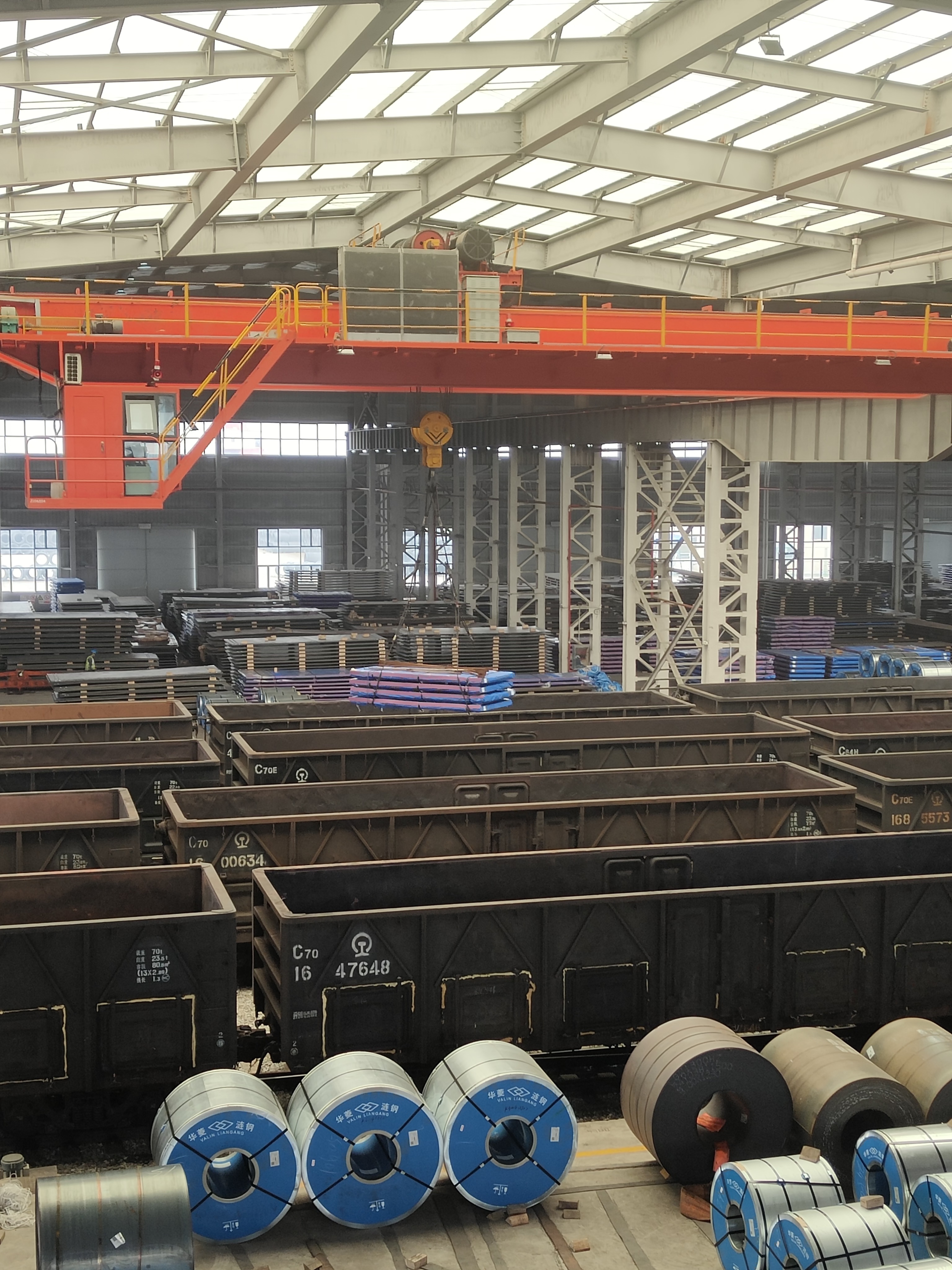 圖為“五一”期間,長沙新港專用鐵路正在裝卸鋼板。