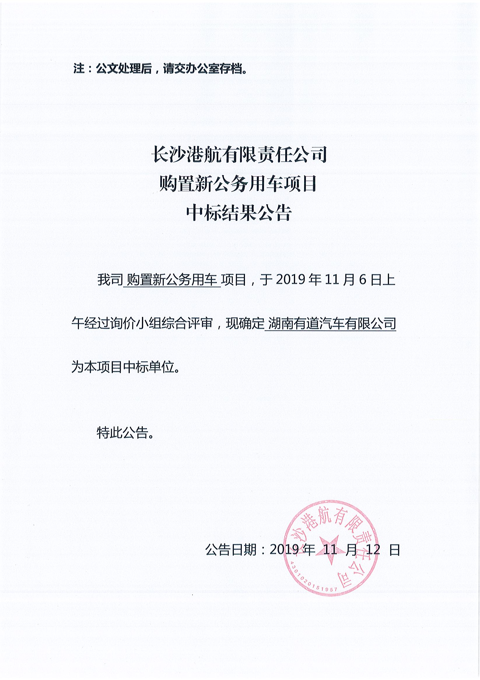 長沙港航有限責(zé)任公司購置新公務(wù)用車項(xiàng)目中標(biāo)結(jié)果公告