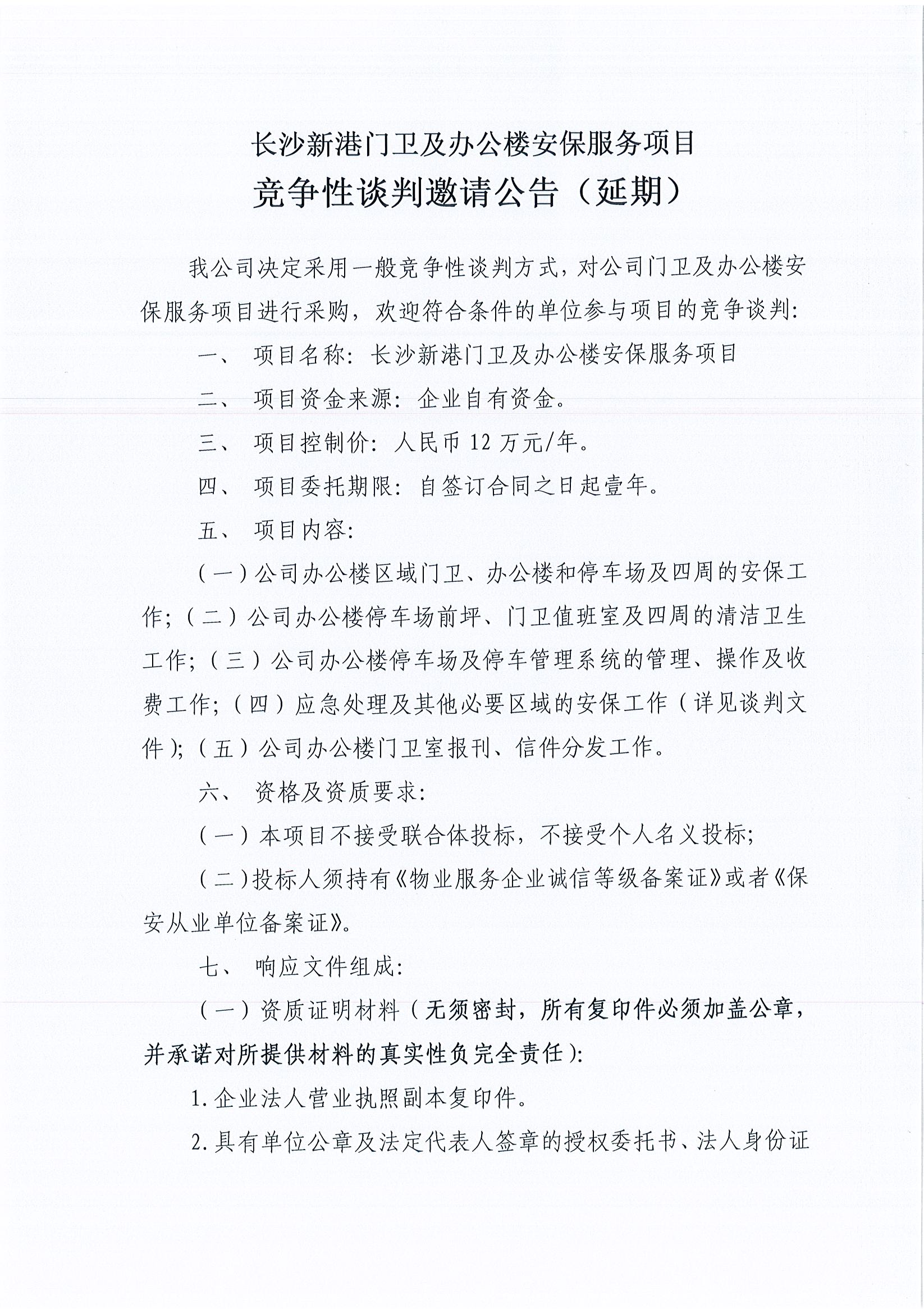 長沙新港門衛(wèi)及辦公樓安保服務(wù)項目競爭性談判邀請公告(延期)