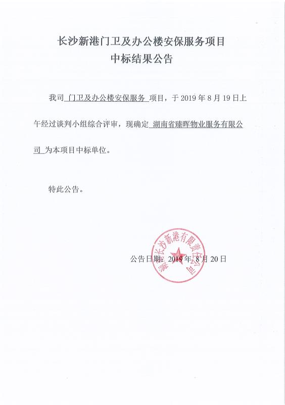 長沙新港門衛及辦公樓安保服務項目中標結果公告