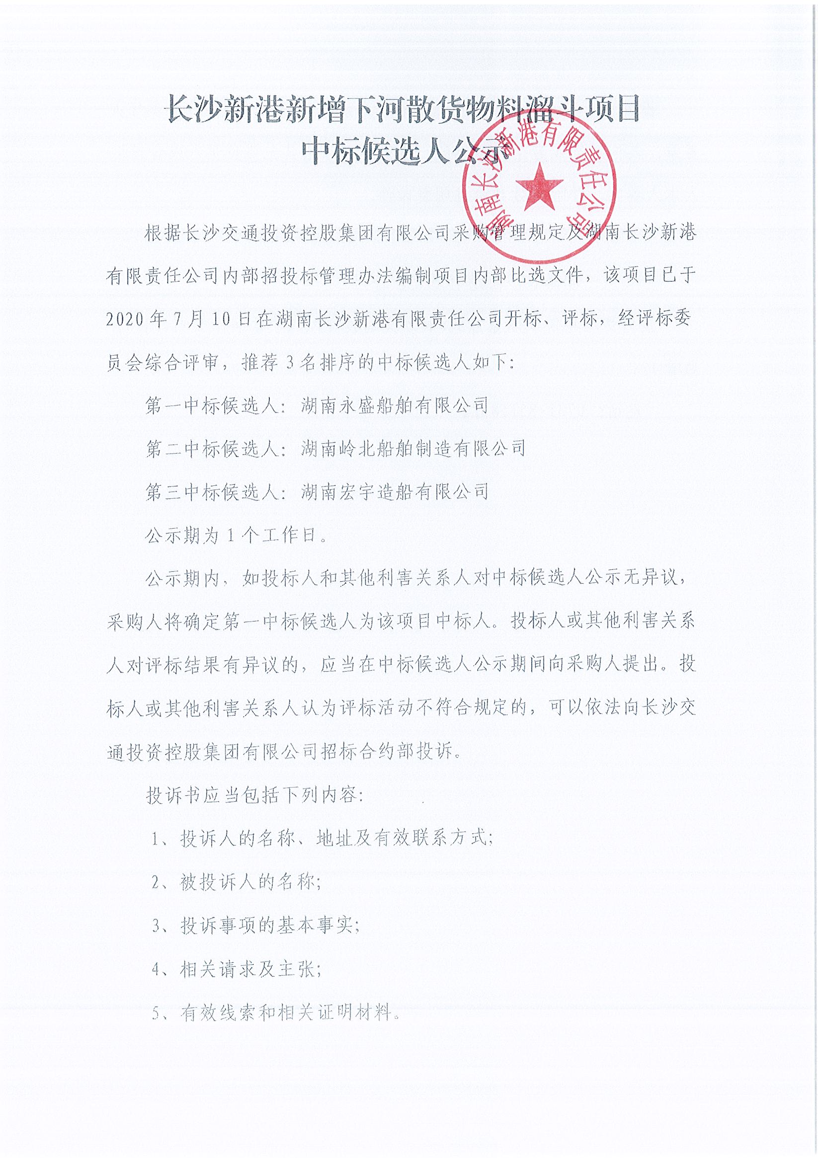 長沙新港新增下河散貨物料溜斗項目中標候選人公示