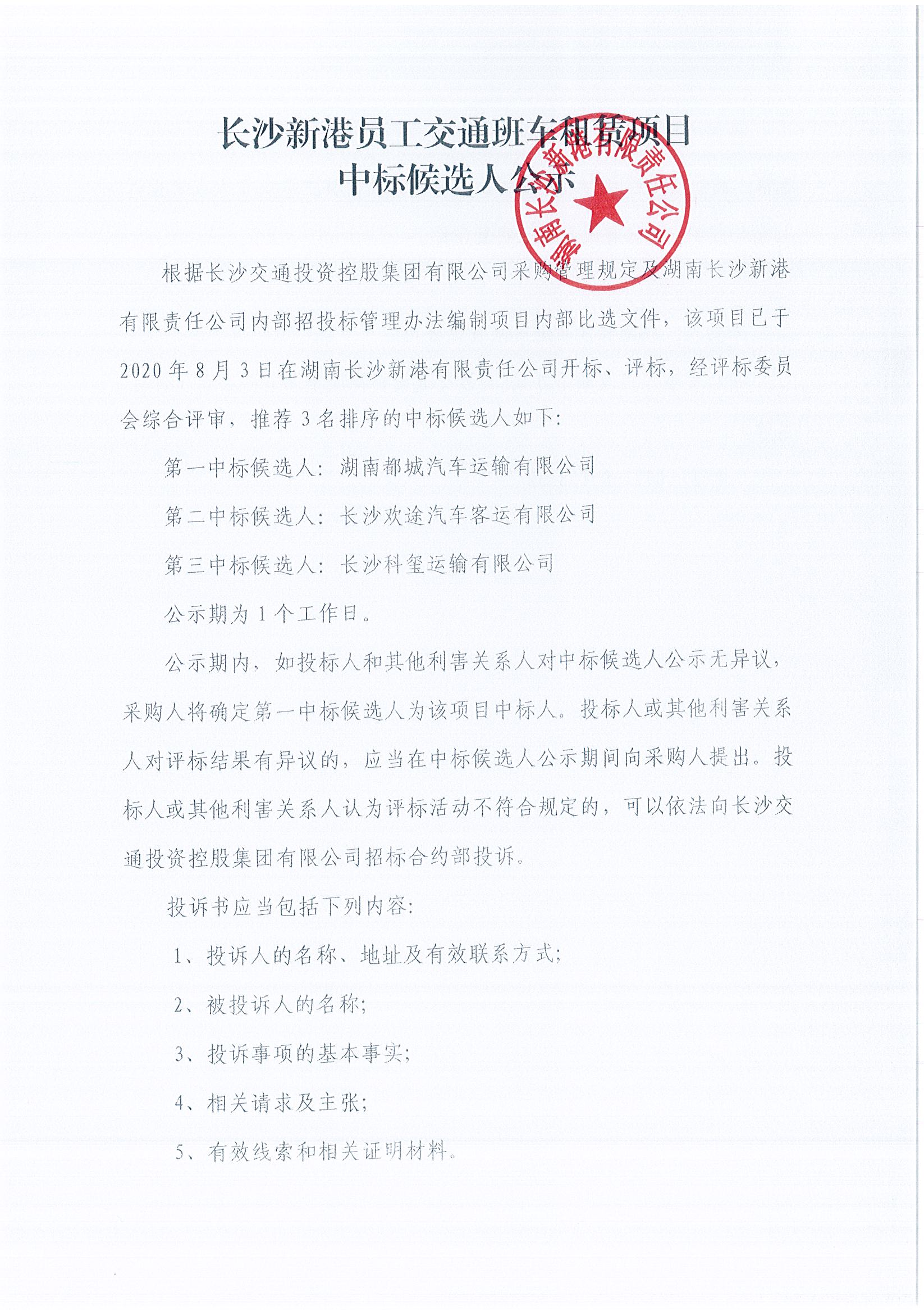 長沙新港員工交通班車租賃項(xiàng)目中標(biāo)候選人公示