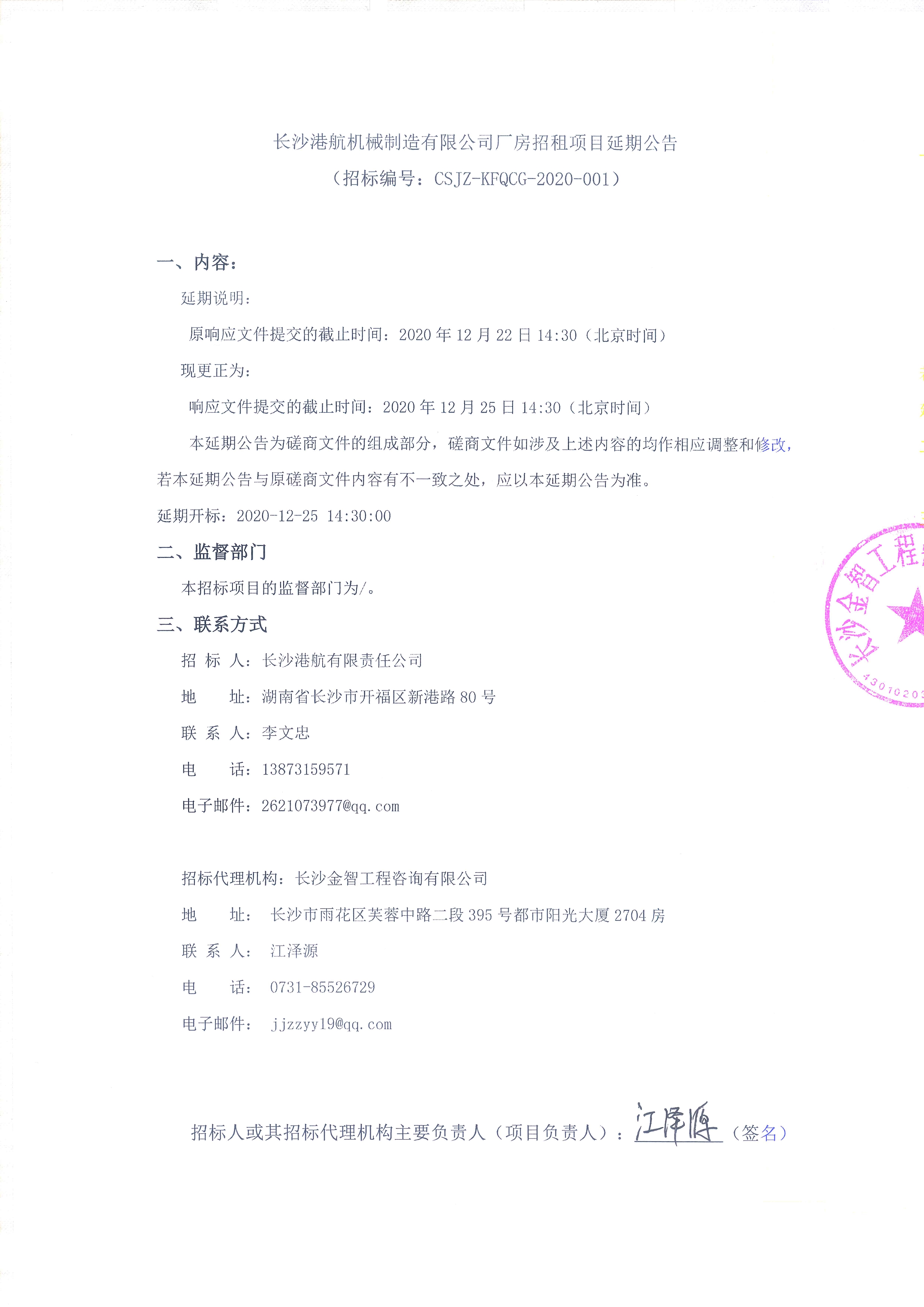 長沙港航機械制造有限公司廠房招租項目延期公告