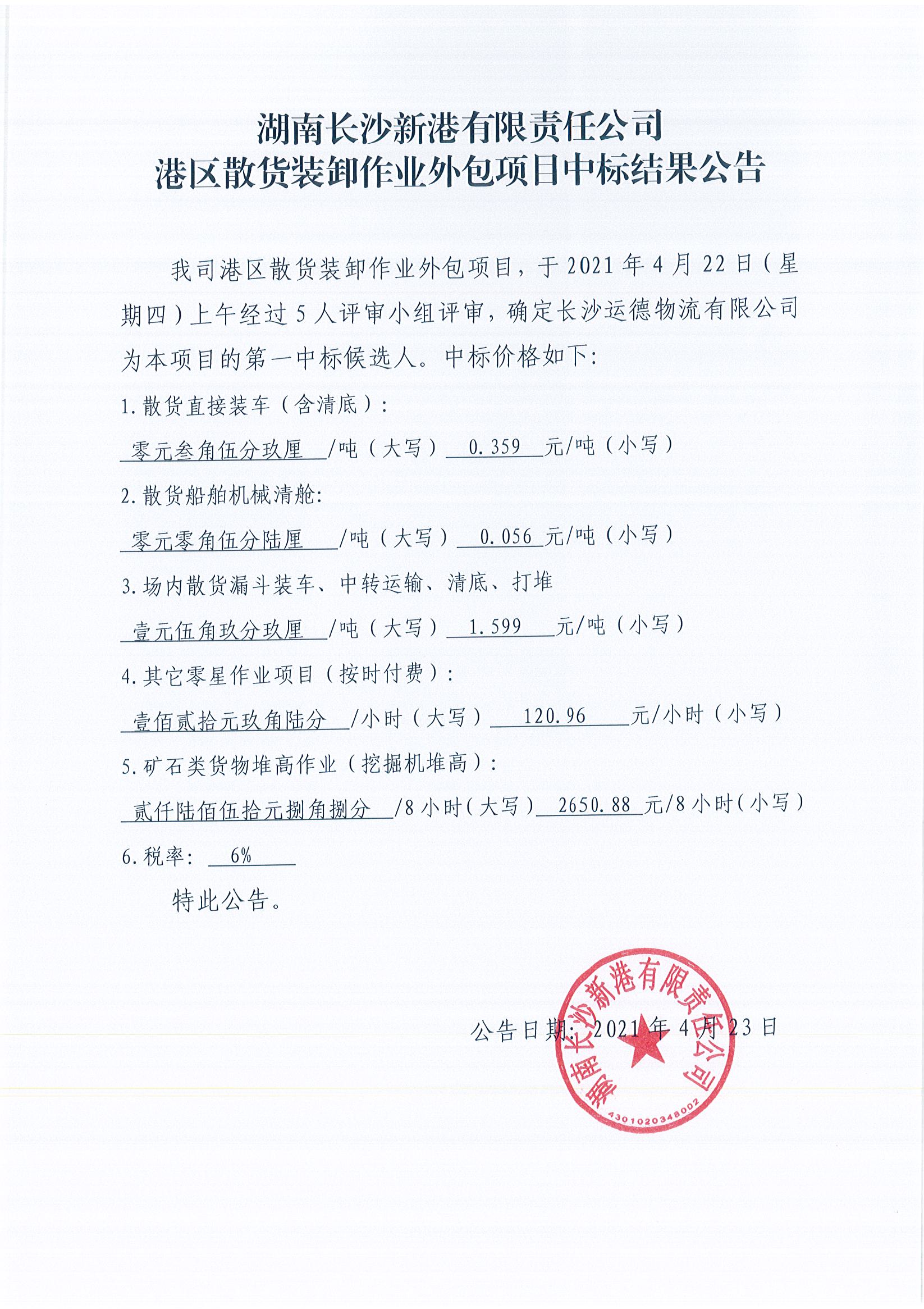 湖南長沙新港有限責任公司港區散貨裝卸作業外包項目中標結果公告