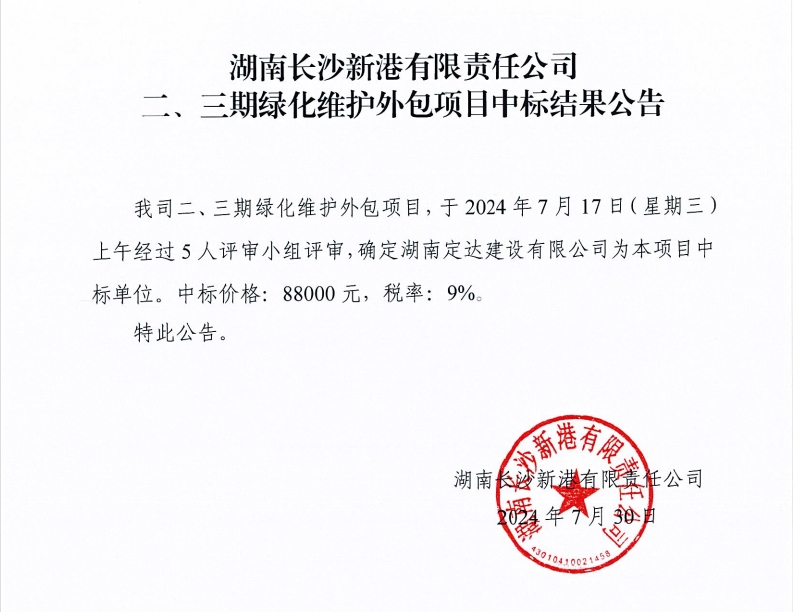 湖南長沙新港有限責(zé)任公司二、三期綠化維護(hù)外包項(xiàng)目中標(biāo)結(jié)果公告
